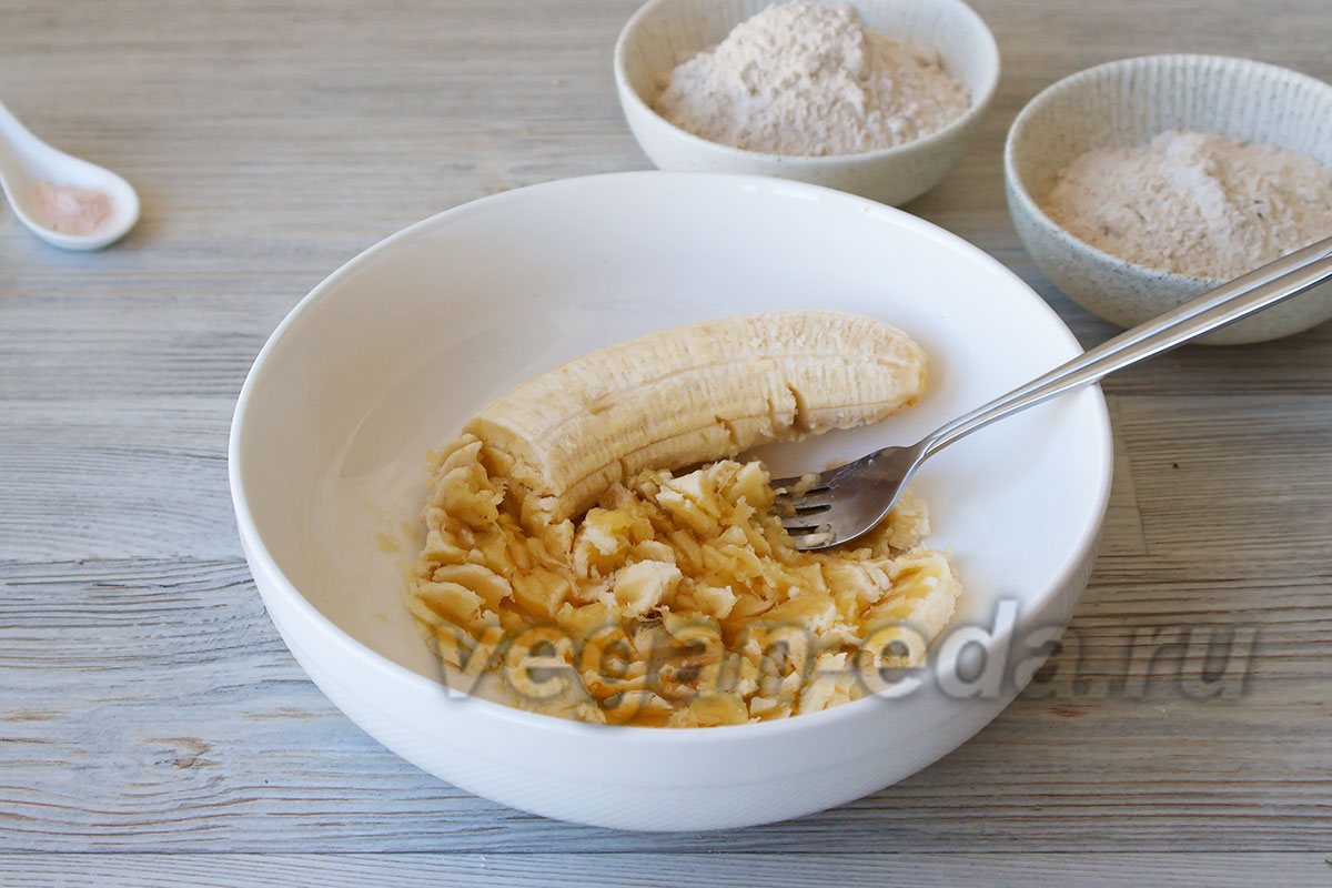 Включите вафельницу, чтобы она разогрелась. - Очистите банан, переложите в миску и разомните вилкой до однородного пюре.