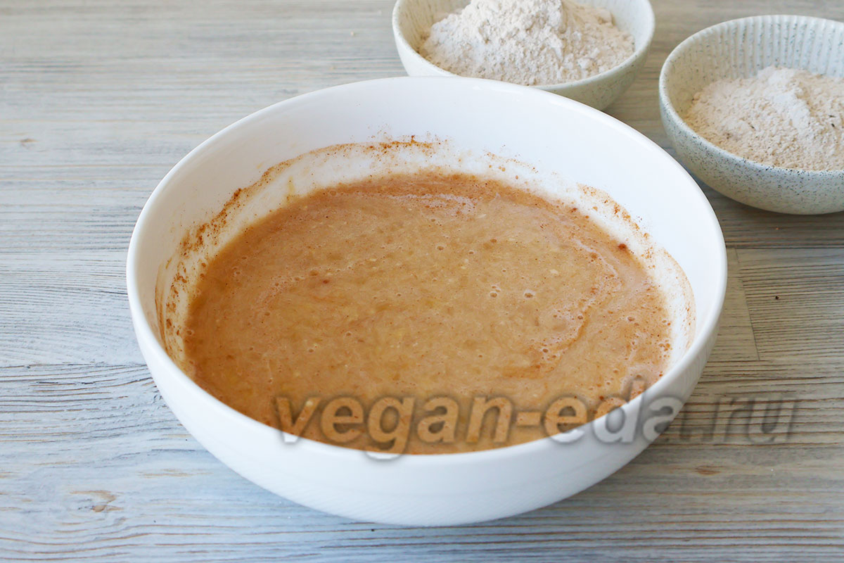 Добавьте сухие ингредиенты к банановому пюре, кроме соды, и перемешайте до однородности.