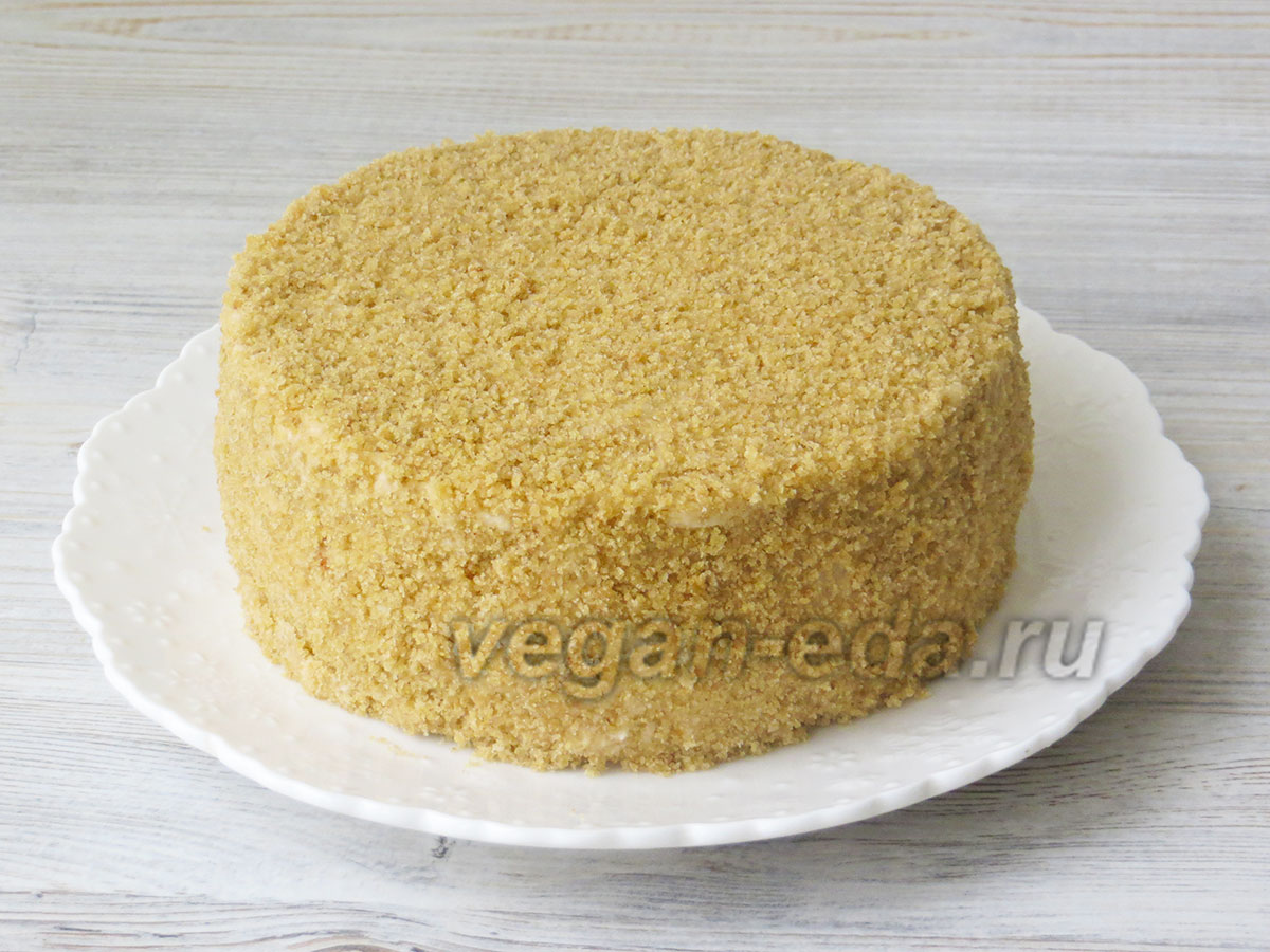 - Посыпьте торт бисквитной крошкой и слегка утрамбуйте её лопаткой. Уберите в холодильник минимум на 2 часа, а лучше на ночь.