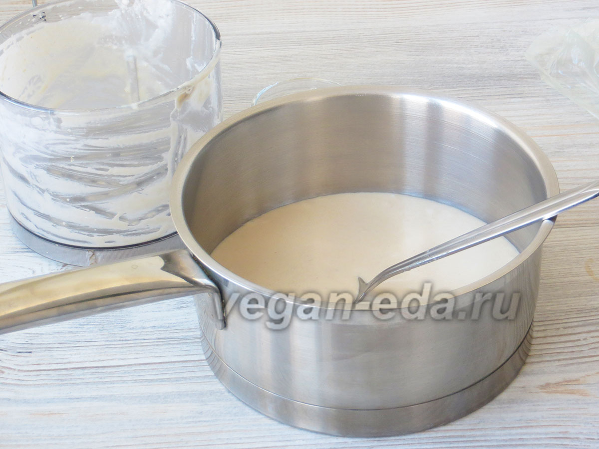 - В блендере смешайте все ингредиенты до однородности. Переложите массу в небольшой сотейник и, непрерывно помешивая, доведите до кипения. Полностью остудите при комнатной температуре или в прохладном месте, затем пробейте погружным блендером до гладкой текстуры. Пока смесь остывает, займитесь тестом.