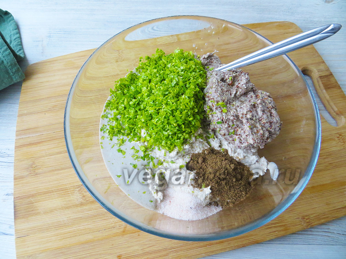 При желании используйте любую свежую или сушёную зелень: базилик, орегано, тимьян или их смесь — ориентируйтесь на вкус. - В глубокой миске соедините измельчённую зелёную гречку и лён. Добавьте закваску, зелень, пряности и соль. Тщательно перемешайте до однородного теста.