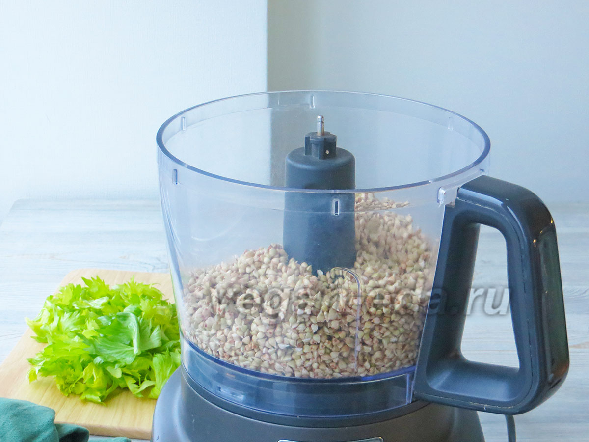 - Пророщенную зелёную гречку переложите в кухонный комбайн, добавьте минимальное количество воды и измельчите до однородной массы. При необходимости останавливайте прибор и соскребайте массу со стенок чаши. Если консистенция получается слишком густой, понемногу добавляйте воду.