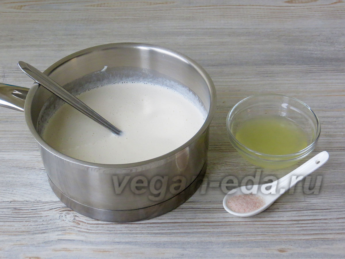 - Когда смесь нагреется до примерно 40-42 °C, снимите кастрюлю с плиты и влейте лимонный сок. Аккуратно перемешайте — ореховая масса начнёт сворачиваться.