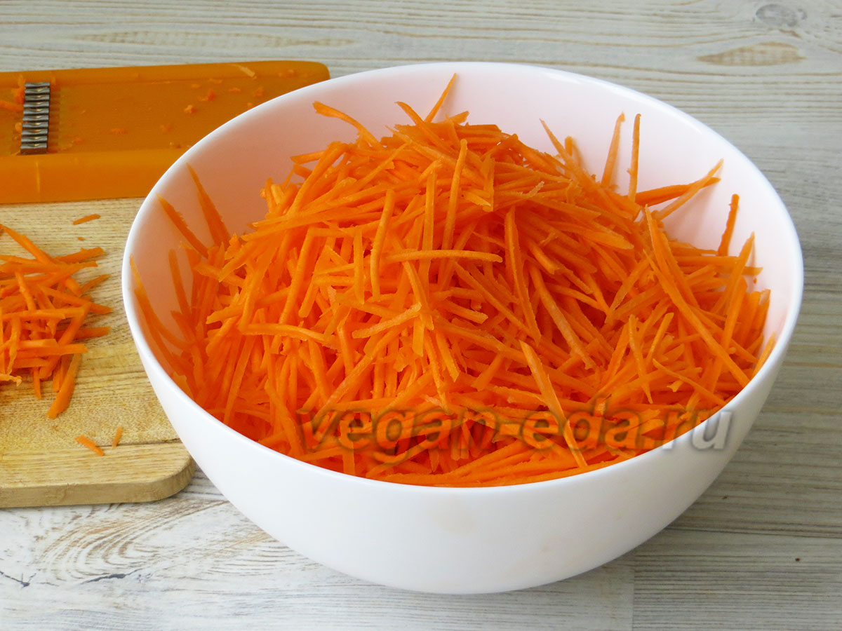 - Натрите морковь на тёрке для корейской закуски — должно получиться около 500 г натёртой массы. Переложите её в большую миску. Добавьте лимонный сок и кокосовые аминокислоты, тщательно перемешайте.