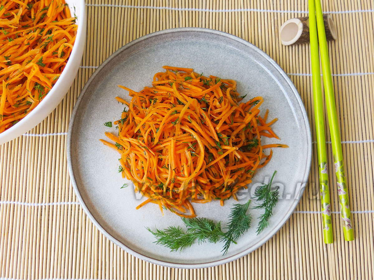 Молотый кориандр придаёт тёплый, глубокий аромат, а укроп добавляет свежесть и лёгкость. Лимонный сок мягко маринует морковь, сохраняя её сочность, благодаря чему салат получается особенно нежным и насыщенным по вкусу.