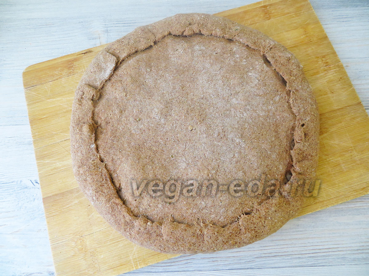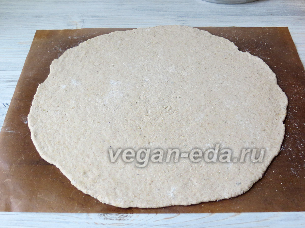 На антипригарном листе раскатайте 2/3 замеса в круг толщиной около 5 мм, при необходимости слегка подпыляя мукой. - Выложите начинку ровным слоем, отступив от края около 5 см.
