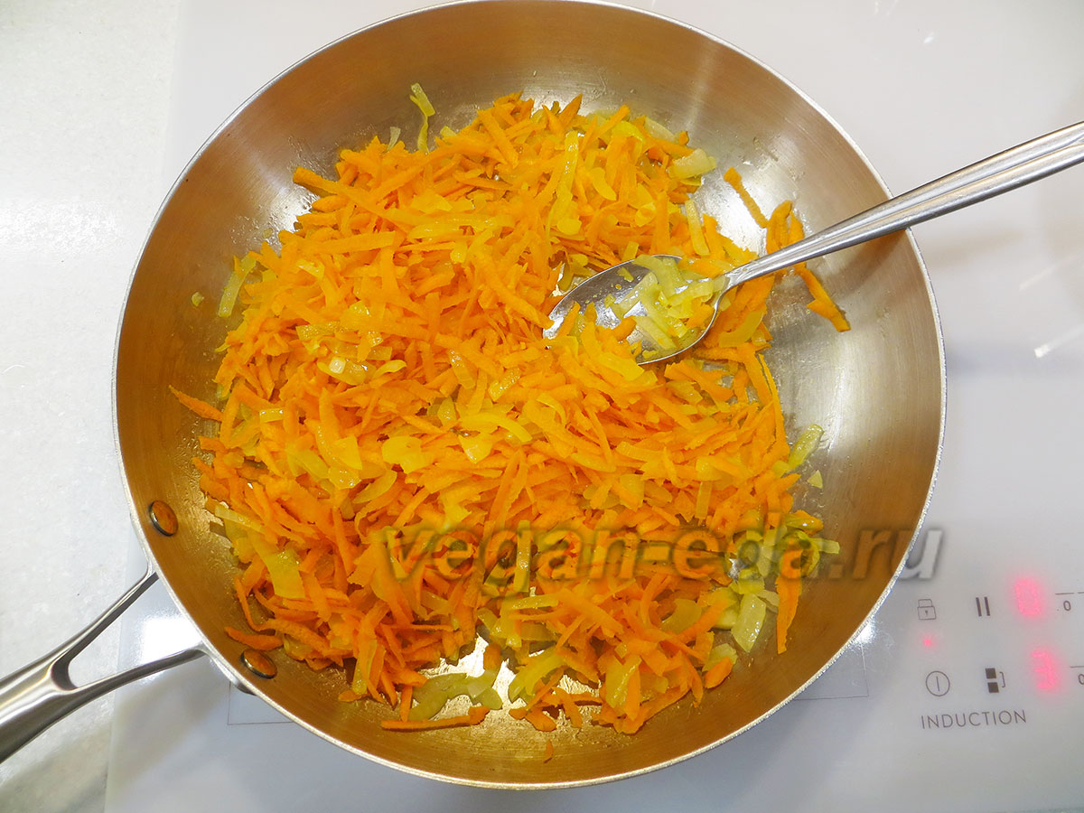 - Натрите морковь на крупной тёрке, добавьте к луку и обжаривайте, помешивая, около 5 минут.