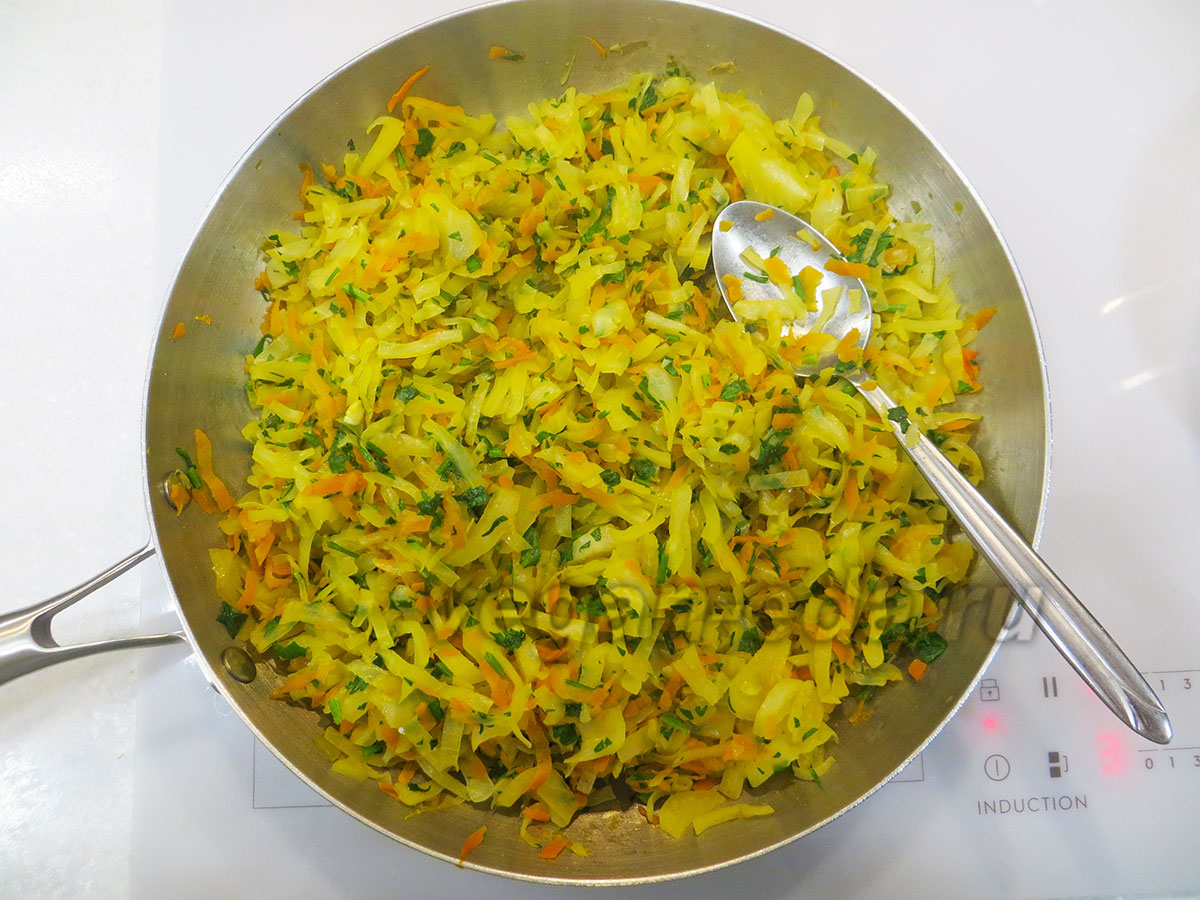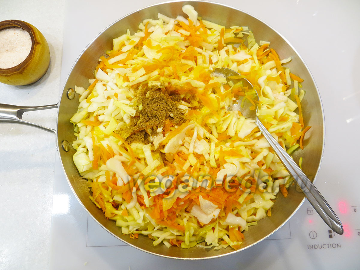 - Нашинкуйте капусту и отправьте её в сковороду к овощам. Добавьте кориандр, специи.