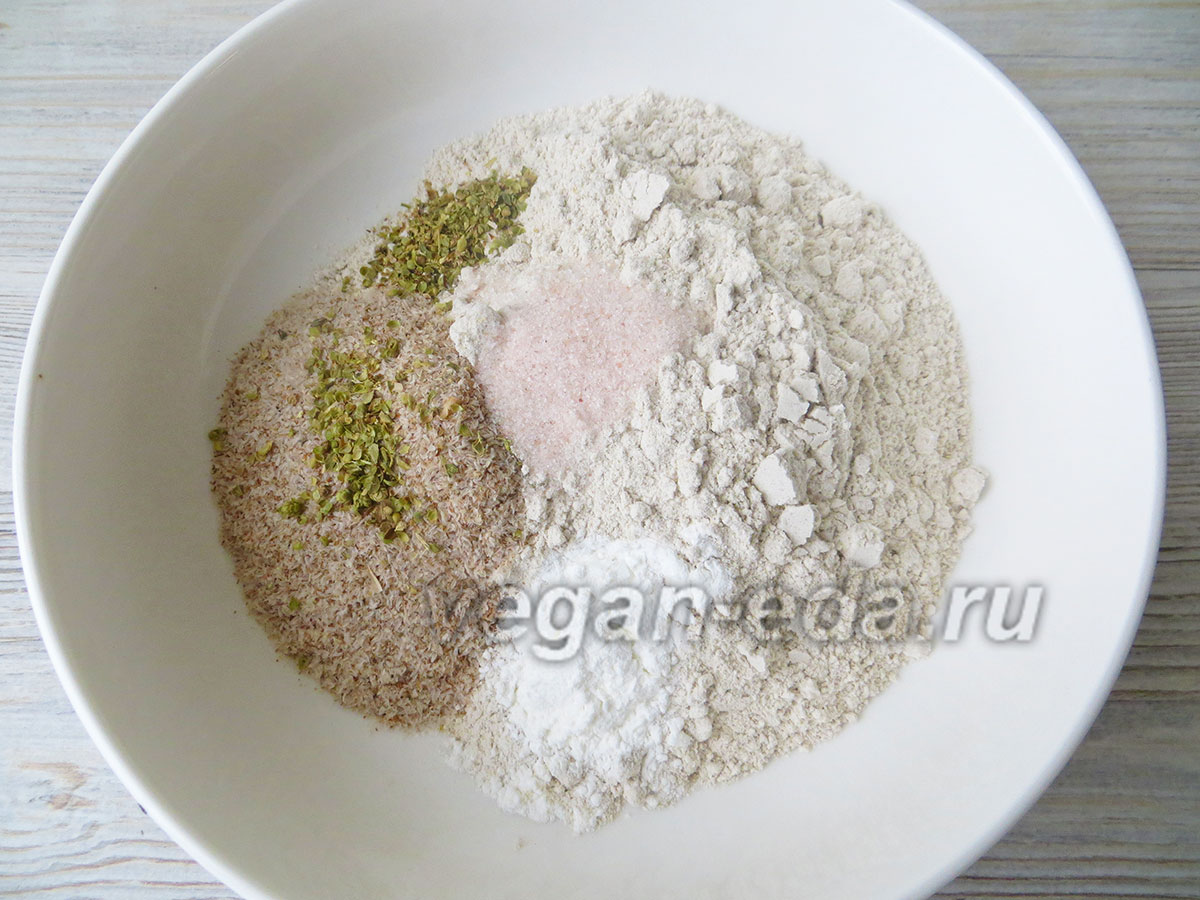 - Смешайте в миске муку, псиллиум, разрыхлитель, соль и орегано.