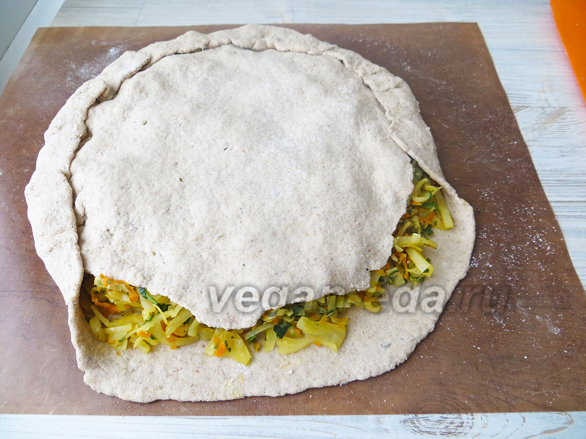 Оставшуюся 1/3 массы раскатайте отдельно и уложите сверху на капусту.