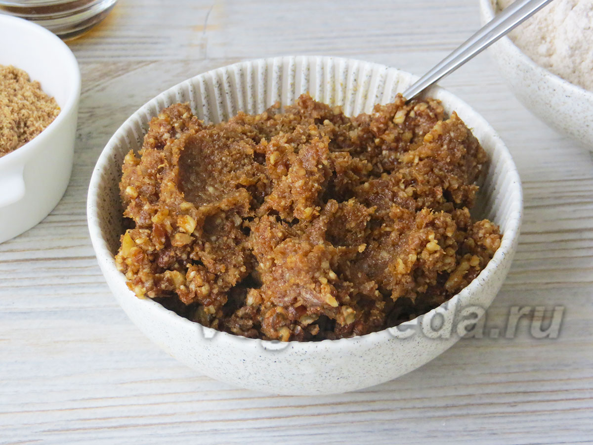 - Переложите орешки и изюм в кухонный комбайн или небольшой блендер, добавьте кокосовый подсластитель и корицу. Измельчите до мелкой, сочной крошки — это будет начинка.
