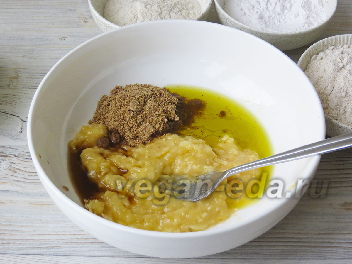 - Разомните вилкой банан в пюре. Добавьте к банану оливковое масло, ваниль, молотый лён. Перемешайте до однородности.