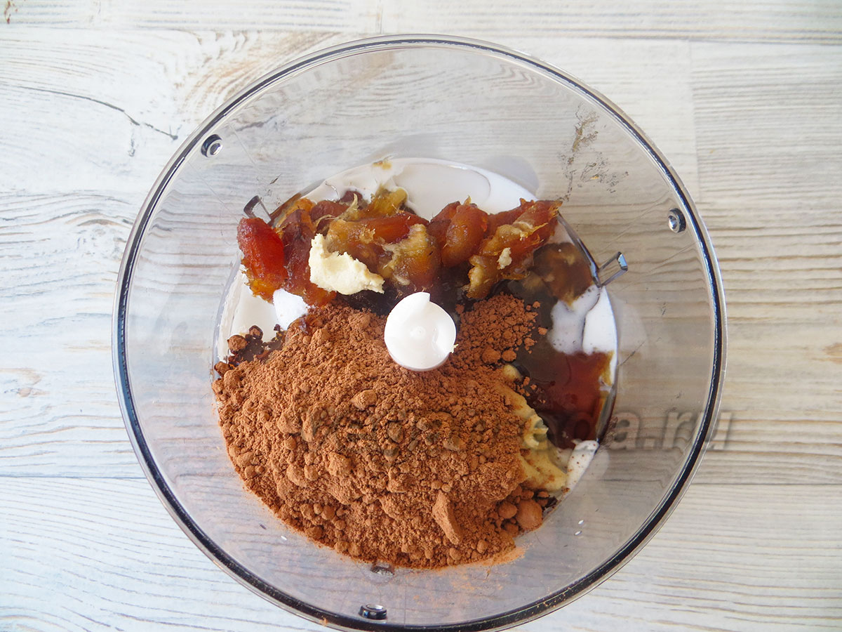 Переложите финики в блендер, добавьте молоко комнатной температуры, растопленное кокосовое масло, кешью-урбеч и какао. - Измельчите все ингредиенты до гладкой, однородной массы.