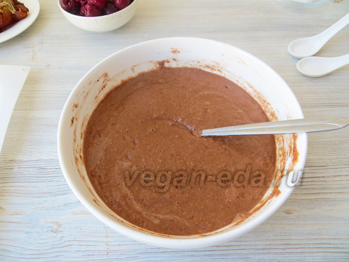 Соедините сухие ингредиенты с жидкими и перемешайте до однородности — шоколадное тесто получится негустым и текучим.