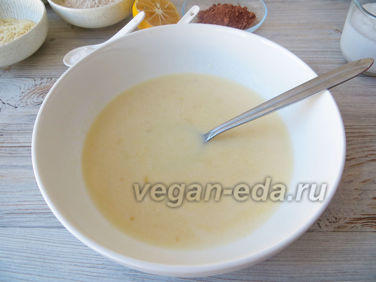- В миску налейте миндальное молоко, добавьте свежевыжатый лимонный сок и яблочное пюре. Перемешайте и отставьте в сторону.