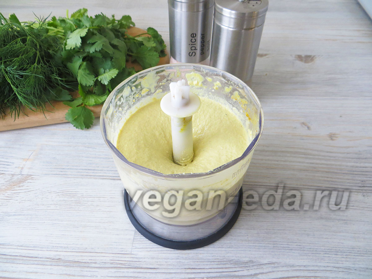 - Прокрутите до однородной, кремовой текстуры. Переложите получившуюся массу в миску. Попробуйте и при необходимости добавьте ещё соли, чесночного порошка, лимонного сока или горчицы.