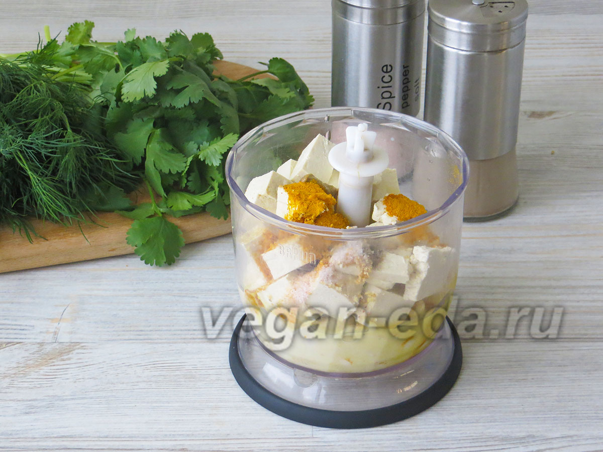 - Нарежьте или разломайте тофу руками. Слейте воду с набухших орехов. Сложите в чашу блендера все ингредиенты, кроме зелени.