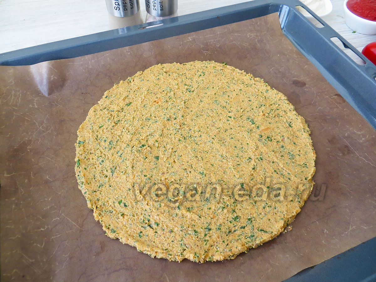 - Выложите тесто на противень и распределите его ложкой, придавая форму круга толщиной 5 мм. Или раскатайте скалкой, положив сверху пергамент.