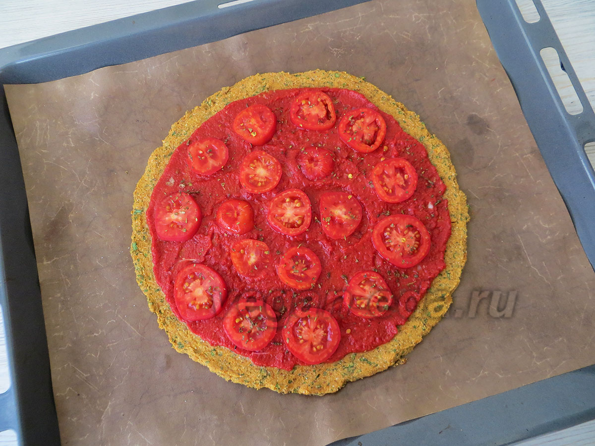 - Смажьте основу томатным соусом, сверху разложите кружочки помидоров. Выпекайте веганскую Маргариту 25-30 минут, или пока края теста не начнут подрумяниваться, а помидоры не станут мягкими.