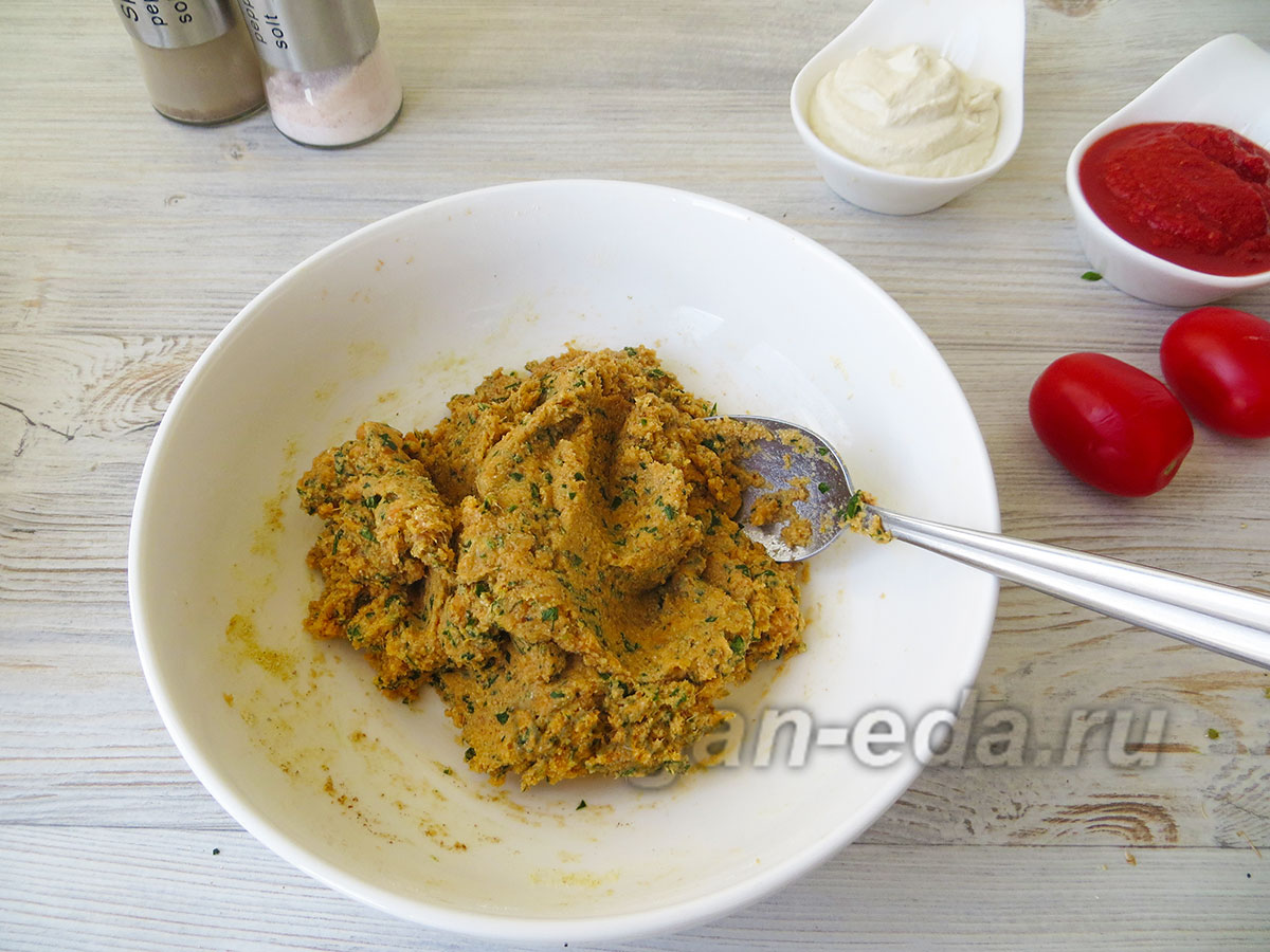 - Мелко нарежьте листья петрушки или кинзы. Сложите все ингредиенты для основы пиццы в миску и перемешайте. Тесто должно получиться как густая паста.