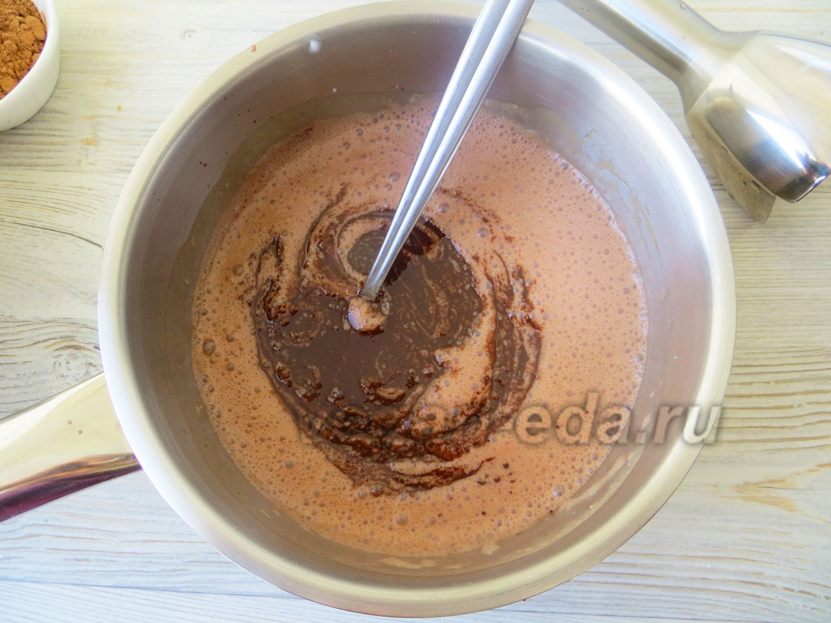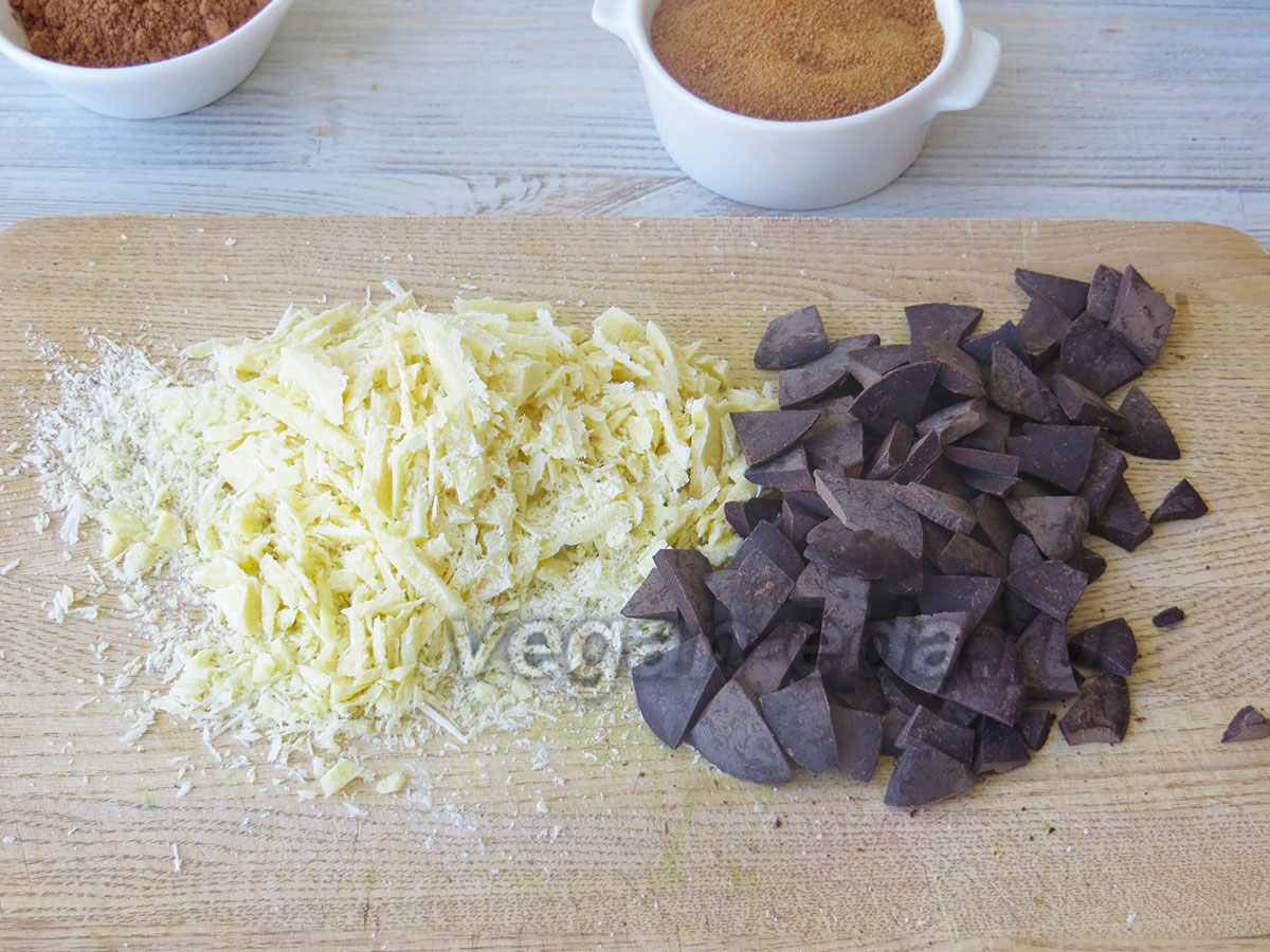 Доведите смесь до кипения, сразу снимите с огня и немного остудите. - Какао-масло и какао тёртое измельчите.