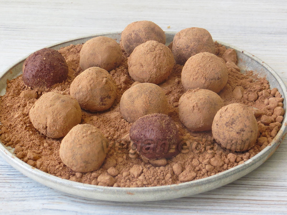 - Из охлаждённой массы сформируйте трюфели, обваляйте их в какао и снова уберите в холодильник на 1–2 часа.